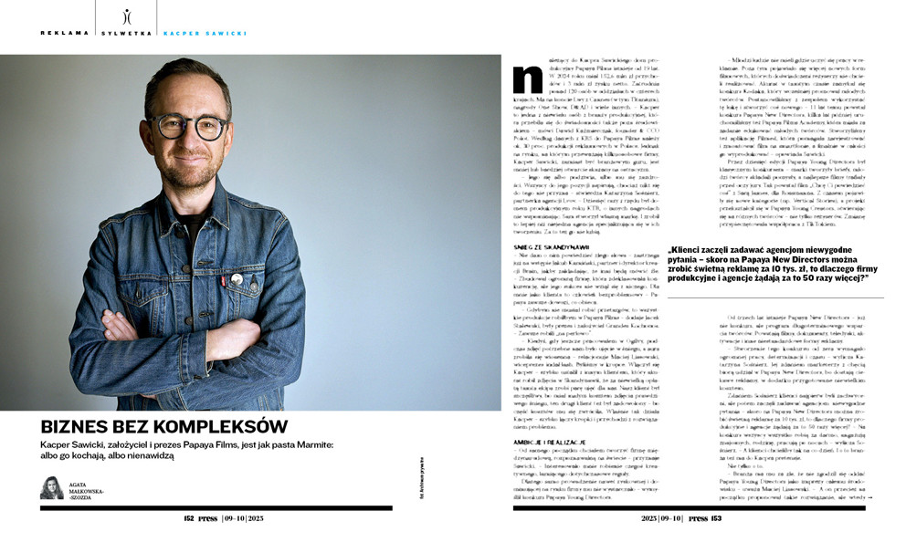 Należący do Kacpra Sawickiego dom produkcyjny Papaya Films istnieje od 19 lat. W 2024 roku miał 152,6 mln zł przychodów i 3 mln zł zysku netto. Zatrudnia ponad 120 osób w oddziałach w czterech krajach. Ma na koncie Lwy z Cannes (w tym Titanium), nagrody One Show, D&AD i wiele innych. – Kacper to jedna z niewielu osób z branży produkcyjnej, która przebiła się do świadomości także poza środowiskiem – mówi Dawid Kaźmierczak, founder & CCO Polot. Według danych z KRS do Papaya Films należy ok. 30 proc. produkcji reklamowych w Polsce. Jednak na rynku, na którym przeważają kilkuosobowe firmy, Kacper Sawicki, zamiast być branżowym guru, jest mniej lub bardziej otwarcie skazany na ostracyzm.