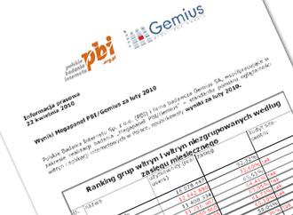 Liderem pozostaje grupa Google, która w lutym br. miała 16,1 mln użytkowników (16 mln w styczniu br.). Wyprzedza witryny należące do Onet.pl – 12,6 mln użytkowników (12,6 mln) i Naszej Klasy – 11,4 mln (11,4 mln). Za nimi były grupy: Gazeta.pl – 11,2 mln (10,9 mln), Wirtualna Polska – 11 mln (11,1 mln), Allegro.pl – 10,8 mln (10,8 mln), Interia.pl – 10,5 mln (10,6 mln), YouTube.com – 10,1 mln (9,9 mln) i o2.pl – 9,7 mln (9,8 mln). Pierwszą dziesiątkę zamyka Wikipedia z 8,5 mln użytkowników (8,7 mln w styczniu br.). W rankingu domen w lutym br. liderem było Google.pl z 15,3 mln użytkowników (w styczniu br. – 15,4 mln). Na kolejnych miejscach znalazły się: Onet.pl – 11,8 mln (11,7 mln), Nasza-klasa.pl – 11,4 mln (11,4 mln), Google.com – 11,2 mln (11,5 mln), Allegro.pl – 10,3 mln (10,3 mln), Wirtualna Polska – 10,1 mln (10,3 mln), YouTube.com – 10,1 mln (9,9 mln), Wikipedia.org – 8,3 mln (8,6 mln), Interia.pl – 7,9 mln (8,2 mln) i Gazeta.pl – 7,6 mln (7,2 mln). Więcej raportu Megapanel PBI/Gemius na Press.pl.(KOZ, 23.04.2010)
