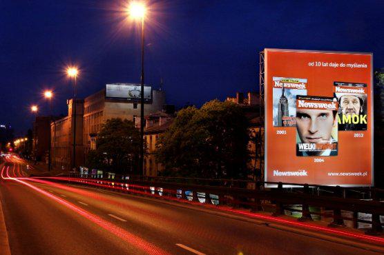 Kampania obejmie też prasę, Internet i nośniki zewnętrzne w Warszawie. Billboardy i backlighty w najbardziej ruchliwych miejscach stolicy przedstawiają szeroko komentowane okładki Newsweeka z 2001, 2004 i 2012 roku, podpisane hasłem "Newsweek Polska – od 10 lat daje do myślenia”. Kreację kampanii reklamowej opracował dział marketingu wydawcy, a za zakup mediów odpowiada dom mediowy MediaCom. (GK, AMS, PR)