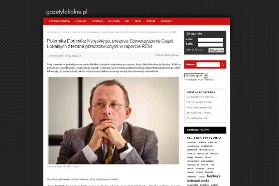 Dominik Księski zamieścił wczoraj na stronie Stowarzyszenia Gazet Lokalnych polemikę z REM. "Wydaję dwa tygodniki o łącznym nakładzie 12.500 egz. nieprzerwanie od 22 lat. Gazet tych nie trzeba finansować – wręcz przeciwnie przychody ze sprzedaży gazety i reklam dają stały dochód i utrzymanie nie tylko mojej rodzinie, ale i rodzinom 21 pracowników. Nie stoi za tym interesem żaden sponsor, fundusze unijne ani pomoc państwa. Gwarancją naszej stabilności ekonomicznej, ale przede wszystkim jej niezależności, są nasi Czytelnicy, którzy kupują (tak, kupują, a nie dostają za darmo!) gazetę. (…) I nie jestem jedyny. Wydawana w ten sposób prasa lokalna to kilkaset tytułów: niezależnych od nikogo oprócz czytelników” - napisał.