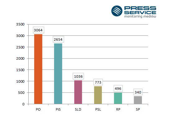 Liczba przekazów medialnych, w których wystąpiły partie polityczne - sierpień 2013 r. (fot. www.press-service.com.pl)