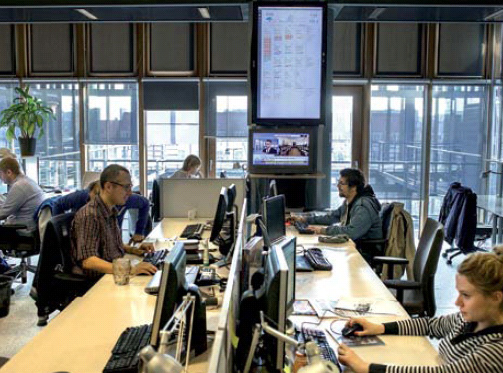 W newsroomie „Pulsu Biznesu” redaktorzy odpowiadający za materiały do gazety siedzą obok dziennikarzy zajmujących się Internetem. (fot. Piotr Król/Press)