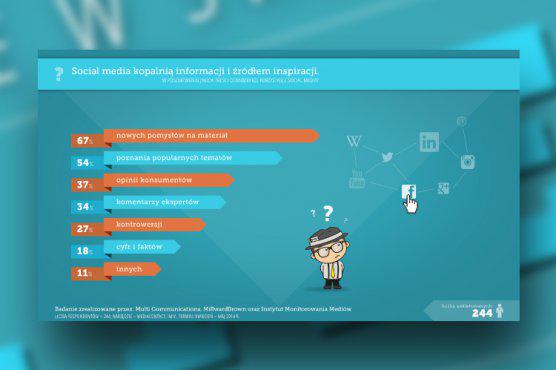 Z raportu „Dziennikarze i Social Media 2014” wynika, że 85 proc. dziennikarzy korzysta z Facebooka, 66 proc. z YouTube, a 48 proc. z Twittera. Tematy pochodzące z mediów społecznościowych są dla nich głównie źródłem inspiracji do przygotowania materiałów (tak deklaruje 67 proc. badanych). W social media szukają też popularnych tematów (54 proc.), opinii konsumentów (37 proc.) oraz komentarzy ekspertów (34 proc.).
