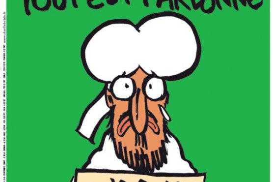 Na okładce tygodnika znajduje się rysunek proroka Mahometa na zielonym tle, ze łzą w oku, trzymającego kartkę z napisem: "Jestem Charlie". Nad podobizną proroka widnieją słowa: "Wszystko zostało przebaczone".