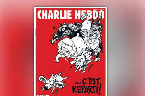 Na upublicznionej wczoraj wieczorem stronie tytułowej nowego numeru tygodnika umieszczono rysunek przestawiający sforę ścigającą małego psa trzymającego w zębach numer ”Charlie Hebedo”. Wśród goniących znalazły się m.in. podobizny papieża Franciszka, byłego francuskiego prezydenta Nicolasa Sarkozy’ego i szefowej Frontu Narodowego – Marine Le Pen. Rysunek podpisano hasłem ”C'est Reparti!” (tłum. ”Znowu się zaczyna!”).