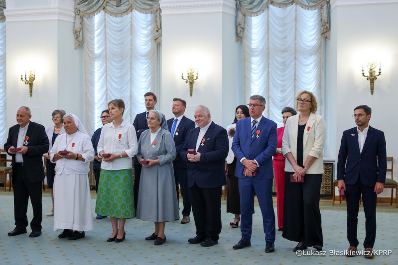 Wśród odznaczonych w piątek znaleźli się Małgorzata Ziętkiewicz z Polsatu, Maksymilian Maszenda z TV Republika i Marcin Tulicki z telewizji wPolsce24 (stoją w drugim rzędzie) (fot. Łukasz Błasikiewicz/KPRP)