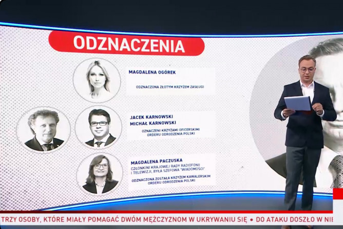 TVP Info, informując o osobach odznaczonych przez prezydenta RP Andrzeja Dudę, pomylił redaktora naczelnego telewizji wPolsce24 Jacka Karnowskiego z byłym prezydentem Sopotu, który nazywa się tak samo.
