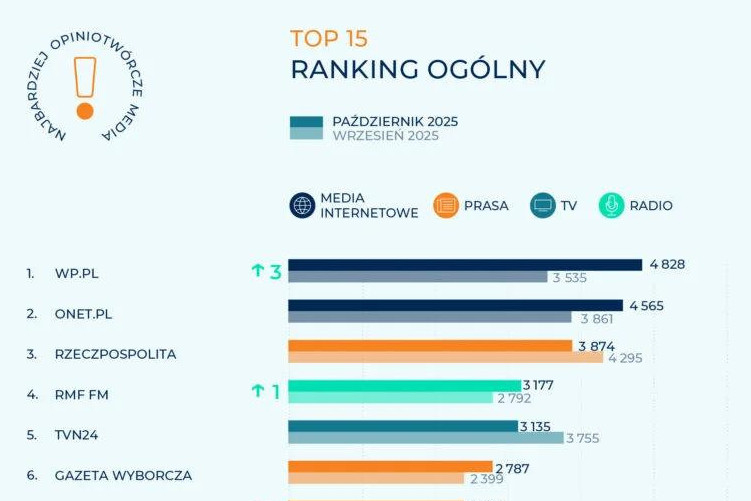 Przeszło 4,8 tys. cytowań Wirtualnej Polski oznacza awans tego portalu o jedno miejsce w porównaniu z rankingiem wrześniowym. Drugi jest Onet (4,6 tys.). Trzecie miejsce w zestawieniu należy do Interii (1,6 tys. powołań). Na czwartej pozycji uplasowały się Sportowefakty.wp.pl (770 cytowań). Na piątej Businessinsider (751), co oznacza o awans o trzy miejsca. Kolejny w zestawieniu jest Money.pl (683 i awans o jedno miejsce). Aż o 14 pozycji awansował Kanalsportowy.pl, zdobywając 558 cytowań i siódme miejsce w grupie.