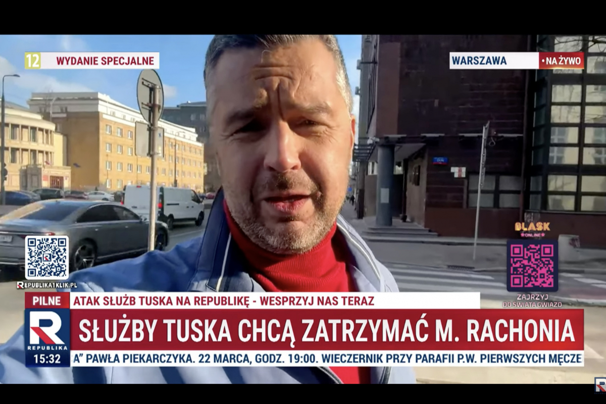 Podczas relacji na żywo w Republice sprzed budynku SKW pojawił się m.in. pasek o treści: "Służby Tuska chcą zatrzymać M. Rachonia" (screen: YouTube.com/Telewizja Republika)