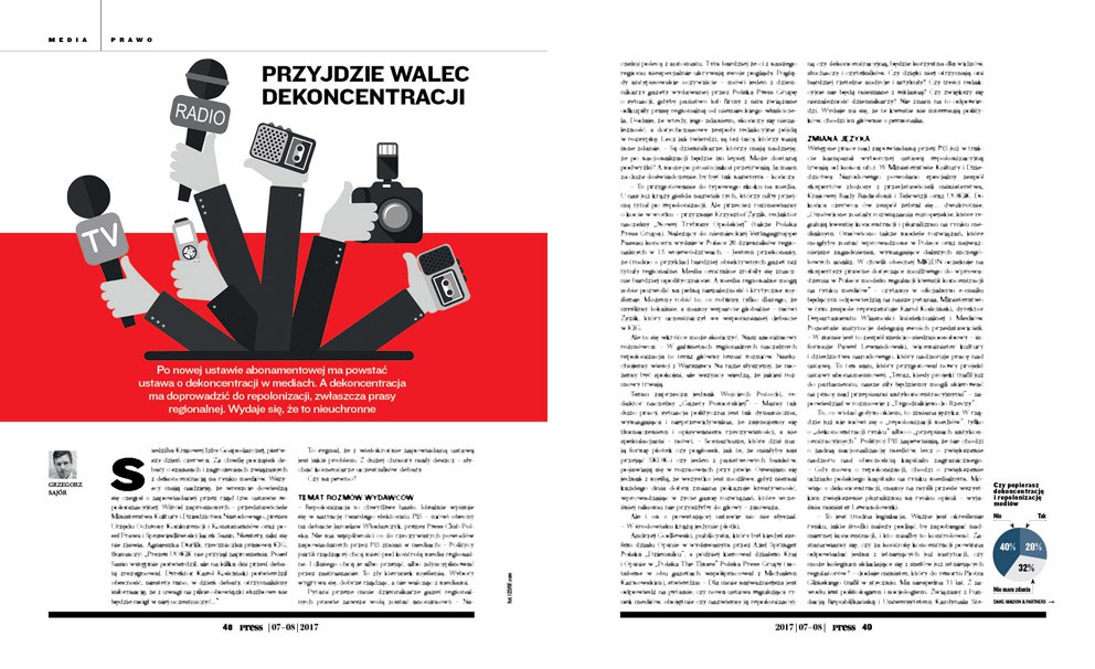 Po nowej ustawie abonamentowej ma powstać ustawa o dekoncentracji w mediach. A dekoncentracja ma doprowadzić do repolonizacji, zwłaszcza prasy regionalnej. Wydaje się, że to nieuchronne