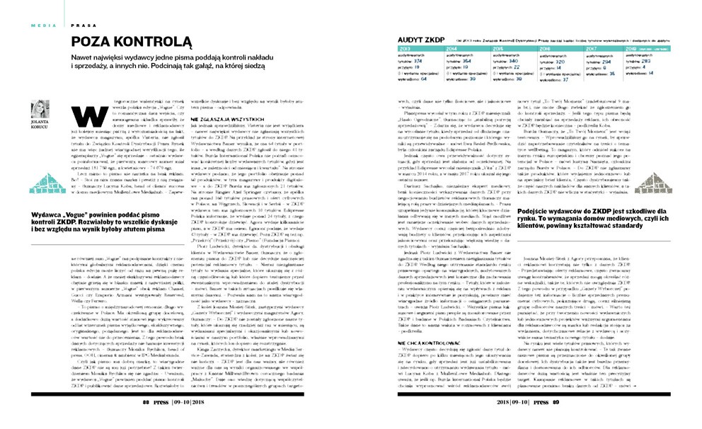 Czyli jak pismo ma dobrą markę, to wiarygodne dane ZKDP nie są mu już potrzebne? Z takim twierdzeniem Monika Rychlica się nie zgadza: – Uważam, że wydawca „Vogue” powinien poddać pismo kontroli ZKDP i publikować dane sprzedażowe. Rozwiałoby to wszelkie dyskusje i bez względu na wynik byłoby atutem pisma – odpowiada.