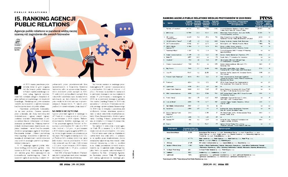 W 15. rankingu agencji public relations według przychodów ogółem – tym razem za 2019 rok – znalazło się 26 agencji i siedem grup firm zajmujących się komunikacją marketingową. Dane finansowe agencji pochodzą z ankiet wypełnionych przez przedstawicieli firm (sprawdzanych w Krajowym Rejestrze Sądowym) albo ze sprawozdań finansowych złożonych przez zarządy do KRS. W niektórych przypadkach zarządy firm odmówiły udzielenia nam dodatkowych informacji, np. listy klientów czy liczby pracowników, których nie ma w sprawozdaniach finansowych. W takich przypadkach w tabeli widnieje „brak danych”.