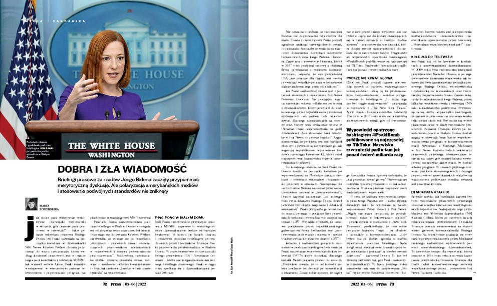 Jeśli Psaki rzeczywiście przyklepie umowę z MSNBC, zapewne to waszyngtońskim dziennikarzom będzie jej bardziej brakować. W końcu po latach chaosu i pyskówek podczas briefingów prowadzonych przez rzeczników Trumpa Psaki przywróciła profesjonalizm w Białym Domu. W przeciwieństwie do rzeczniczki byłego prezydenta USA – Stephanie Grisham – która nie zorganizowała ani jednego briefingu prasowego, Psaki w ciągu roku spotkała się z dziennikarzami ponad 200 razy.
