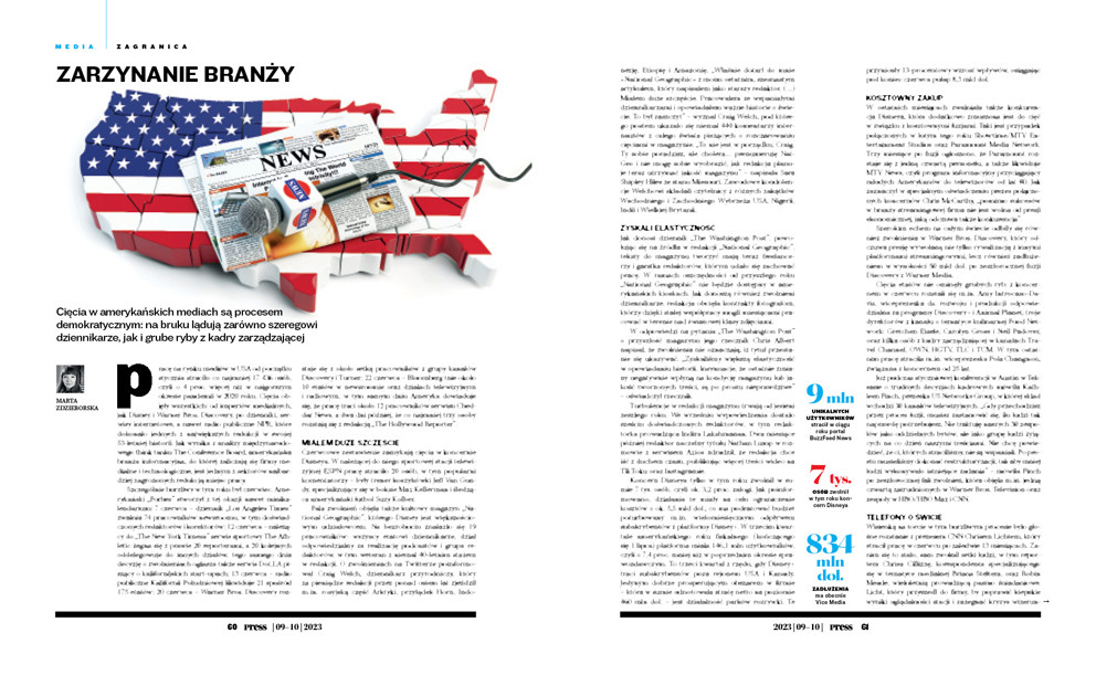 Szczególnie burzliwy w tym roku był czerwiec. Amerykański „Forbes” stworzył z tej okazji nawet minikalendarium: 7 czerwca – dziennik „Los Angeles Times” zwalnia 74 pracowników newsroomu, w tym doświadczonych redaktorów i korektorów; 12 czerwca – należący do „The New York Timesa” serwis sportowy The Athletic żegna się z prawie 20 reporterami, a 20 kolejnych oddelegowuje do innych działów, tego samego dnia decyzję o zwolnieniach ogłasza także serwis Dot.LA piszący o kalifornijskich start-upach; 13 czerwca – radio publiczne Kalifornii Południowej likwiduje 21 spośród 175 etatów; 20 czerwca – Warner Bros. Discovery rozstaje się z około setką pracowników z grupy kanałów Discovery i Turner; 22 czerwca – Bloomberg tnie około 10 etatów w newsroomie oraz działach telewizyjnym i radiowym, w tym samym dniu Ameryka dowiaduje się, że pracę traci około 12 pracowników serwisu Cheddar News, a dwa dni później, że co najmniej trzy osoby rozstają się z redakcją „The Hollywood Reporter”.
