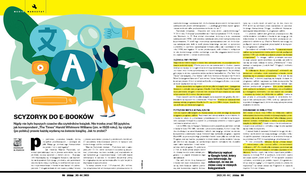 Jak twierdzi Marcin Parzyński, adwokat specjalizujący się w prawie autorskim, na ten problem można spojrzeć z dwóch stron: – Kupując cyfrową książkę, np. w księgarni Amazon, tak naprawdę nie kupujemy fizycznego produktu, ale zawieramy umowę licencyjną z tą firmą, w myśl której nie możemy rozpowszechniać e-booków ani łamać ich zabezpieczeń. Z drugiej jednak strony mamy polską Ustawę o prawie autorskim i prawach pokrewnych, której art. 23 umożliwia wykorzystanie utworu w ramach tzw. dozwolonego użytku osobistego.