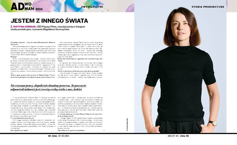 Może to paradoksalnie mi pomogło – jestem osobą z innego świata. Wnoszę inne spojrzenie, nowy sposób pracy. Mam doświadczenie w prowadzeniu zespołów, transformacjach organizacyjnych i budowaniu nowej kultury organizacji. W Papaya Films to się przydało. Wchodząc tu, miałam też pełne zaufanie od właściciela – Kacpra Sawickiego. Wiedział, że potrzebna jest zmiana, i dał mi zielone światło, żeby ją wprowadzić.