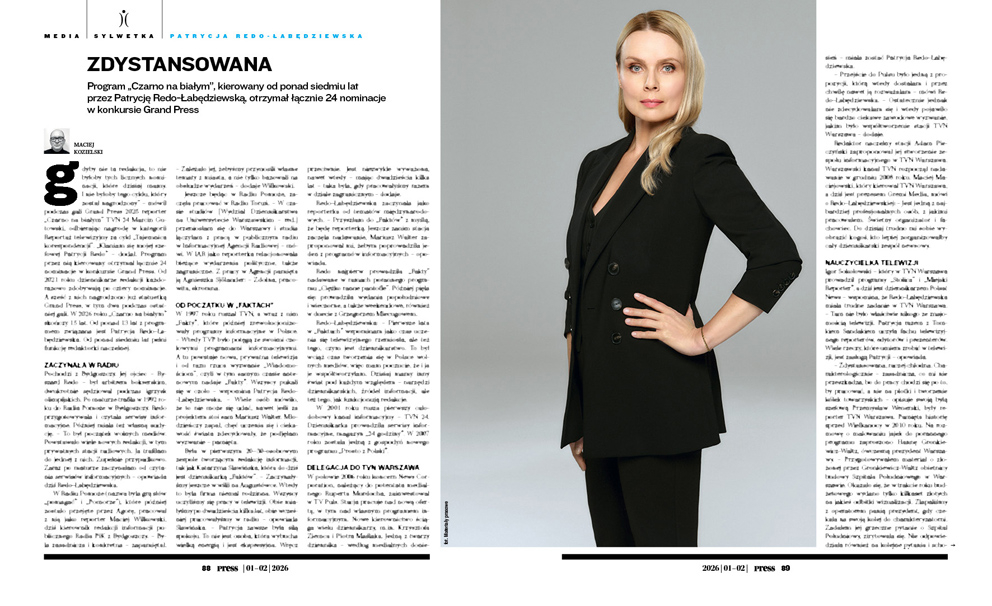 Gdyby nie ta redakcja, to nie byłoby tych licznych nominacji, które dzisiaj mamy. I nie byłoby tego cyklu, który został nagrodzony” – mówił podczas gali Grand Press 2025 reporter „Czarno na białym” TVN 24 Marcin Gutowski, odbierając nagrodę w kategorii Reportaż telewizyjny za cykl „Tajemnica korespondencji”. „Kłaniam się mojej szefowej Patrycji Redo” – dodał. Program przez nią kierowany otrzymał łącznie 24 nominacje w konkursie Grand Press. Od 2021 roku dziennikarze redakcji każdorazowo zdobywają po cztery nominacje. A sześć z nich nagrodzono już statuetką Grand Press, w tym dwa podczas ostatniej gali. W 2026 roku „Czarno na białym” skończy 15 lat. Od ponad 13 lat z programem związana jest Patrycja Redo-Łabędziewska. Od ponad siedmiu lat pełni funkcję redaktorki naczelnej.