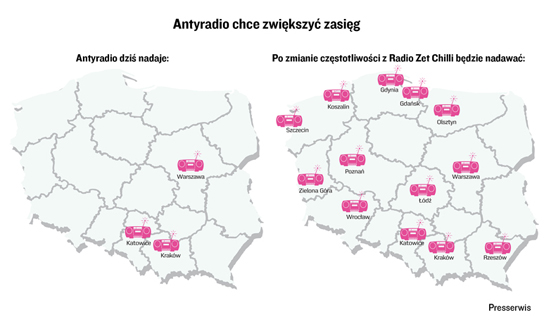 Dziś ponadregionalne Radio Zet Chilli nadaje w 13 miastach, a sieć Antyradio tworzą stacje w Warszawie, Krakowie i Katowicach. Według ustaleń "Presserwisu" Antyradio miałoby przejąć 12 częstotliwości Zet Chilli. Zamiany nie będzie na Śląsku, bo tam Zet Chilli ma koncesję lokalną o wyspecjalizowanym charakterze muzycznym, a Antyradio na Śląsku ma już swoją częstotliwość. W Warszawie i Krakowie, gdzie Antyardio też jest obecne, zamieni się częstotliwościami z Zet Chilli. Po zmianie Antyradio nadawać będzie w 13 miastach, a Zet Chilli w trzech aglomeracjach (Warszawa, Kraków, Katowice).