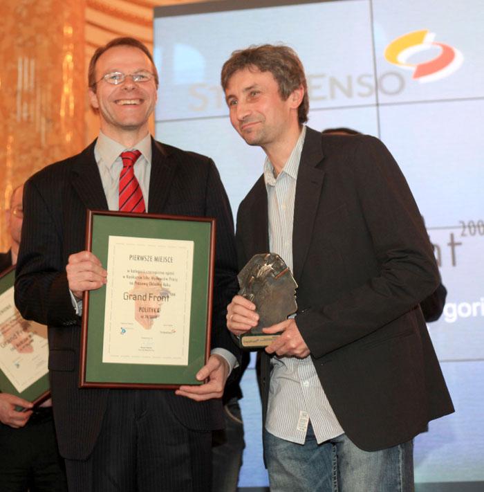 I miejsce w kategorii Czasopisma opinii dla "Polityki". Z nagrodą Piotr Zmelonek, dyrektor pionu wydawniczego w "Polityce" i autor okładki Marek Kwiatkowski.