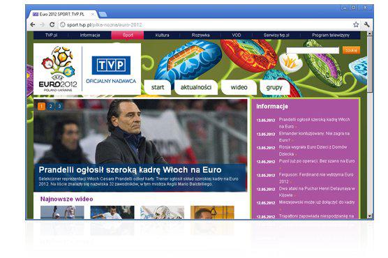 W czwartek nowy wygląd zyska strona TVP dedykowana turniejowi. Oglądać będzie można na niej za darmo transmisje z wszystkich 31 spotkań rozgrywanych na polskich i ukraińskich arenach (TVP jest oficjalnym nadawcą rozgrywek). Internauci każde spotkanie obejrzą w jakości HD. Transmisje oglądać będzie można nie tylko na komputerach, ale też na urządzeniach mobilnych. W tym celu TVP nawiązała współpracę z Telekomunikacją Polską SA (czytaj wyżej). TVP na swoich stronach ma również umieszczać materiały o wszystkich 16 zespołach uczestniczących w turnieju.