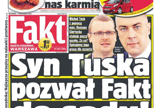 ”Składamy wniosek w związku z naruszeniem dóbr osobistych. Tabloid <<Fakt>> insynuuje współwinę pana Michała Tuska za aferę Amber Gold. Nie widziałem jeszcze czegoś takiego, żeby tabloid pod zdjęciem jakiejś osoby podpisywał, że grozi jej 10 lat, w sytuacji, gdy nie ma żadnych zarzutów. Od kilku dni trwa nagonka na Michała Tuska” - powiedział PAP Giertych, który reprezentuje syna szefa rządu.