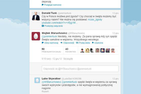 W środę premier Tusk zamieścił na Twitterze wpis: "Czy w Polsce możliwa jest zgoda? Czy chociaż w święta możemy być wszyscy razem? Nie można się poddawać". Wojciech Staruchowicz zripostował: "Niestety nie możemy. Za pana sprawą mój syn spędzi święta samotnie w więzieniu. Wszystkiego wesołego".