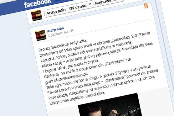 Szefowie Antyradia (Eurozet) zdjęli z ramówki ”Gastrofazę” Pawła Lorocha. Ponieważ słuchacze zaprotestowali, stacja ogłosiła na Facebooku, że program wróci na antenę, jeśli zbierze 5 tys. głosów poparcia.
