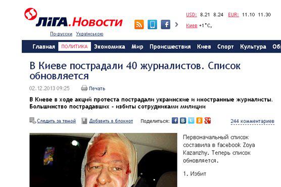 Ukraińskie i rosyjskie media oraz dziennikarze w mediach społecznościowych publikują listy dziennikarzy, którzy zostali pobici podczas niedzielnych demonstracji w Kijowie. Poniższa lista została opracowana na podstawie informacji z serwisu internetowego rosyjskiej gazety „Nowaja Gazieta” i serwisu Liga.net.