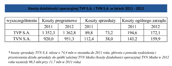 W 2011 r. 82,6% kosztów TVP S.A. przeznaczanych było na podstawową działalność Spółki, czyli program. W przypadku TVN było to tylko 78,3%. Co istotne koszty sprzedaży w TVP S.A. były prawie dwukrotnie niższe, niż w przypadku TVN. Koszty ogólnego zarządu (czyli wszystkiego, co nie dotyczy bezpośrednio programu TV) w przypadku telewizji publicznej były również niższe, niż w przypadku telewizji komercyjnej. Wydatnie to świadczy o efektywności TVP S.A. i koncentracji na realizacji podstawowej działalności, czyli realizacji misji publicznej.