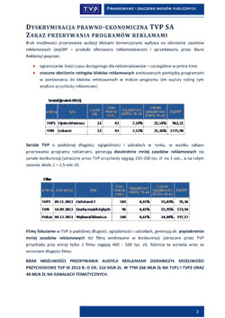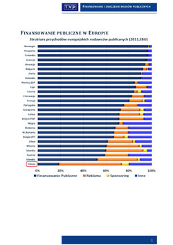 Podobnie obowiązek udostępniania sygnału za darmo sprawia, że TVP może przy tak niskim zasileniu abonamentem pozyskiwać środki praktycznie wyłącznie z reklam i sponsoringu i jest od tych źródeł dochodu uzależniona drastycznie bardziej, niż nadawcy komercyjni, w tym Cyfrowy Polsat i Grupa TVN, dla których pozareklamowe wpływy stanowią odpowiednio: 62 i 30%, a reklamowe: 31 i 49%. Dla TVP reklama i sponsoring w 2012 roku to aż 67% budżetu! (abonament: 17%)