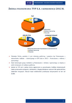 Jest to wynik wyraźnie lepszy, niż dwóch jej największych konkurentów – Polsat i TVN, mimo że nie dotyczą ich żadne, wspomniane powyżej, ograniczenia w nadawaniu, w emitowaniu reklam, pobieraniu opłat, nie są zobowiązane do jakiejkolwiek działalności misyjnej, mogą też ściągać znaczne sumy pieniędzy z rynków finansowych (giełda, kredyty itp.) na nowe inwestycje i promocję.