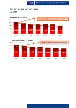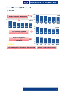 W dodatku w ciągu ostatnich pięciu lat, kiedy zasilenie z abonamentu drastycznie zaczęło się obniżać, Telewizja Polska wcieliła ogromny program oszczędności i restrukturyzacji, który zaowocował m.in. zmniejszeniem budżetu o 32%, zatrudnienia o 28% i wynagrodzeń o aż 35%.