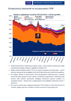 Z mitem o niegospodarności TVP połączony jest mit o odwracaniu się masowego widza od oferty telewizji publicznej. W micie tym po pierwsze przypisuje się niesłusznie Telewizji Polskiej jakiś nadzwyczajny udział w nieuniknionym skądinąd spadku oglądalności wielkich kanałów ogólnotematycznych wynikający z cyfryzacji i wspólny dla wszystkich rozwiniętych krajów europejskich. Tymczasem twarde dane oglądalności dowodzą po pierwsze, że akurat TVP, po przejściowym spadku po całkowitej likwidacji nadawania analogowego w Polsce, jest znowu na trendzie wznoszącym. Po drugie, że większość wielkich nadawców, a wśród nich przede wszystkim Telewizja Polska, skutecznie realizuje strategię dywersyfikacji. Dzięki konsekwentnemu tworzeniu nowych kanałów, zwanych niszowymi lub tematycznymi, cała TVP niezmiennie ma zdecydowanie ponad 30% rynku telewizyjnego w Polsce (w całym roku 2013 – ponad 30%, w styczniu br – 32%).