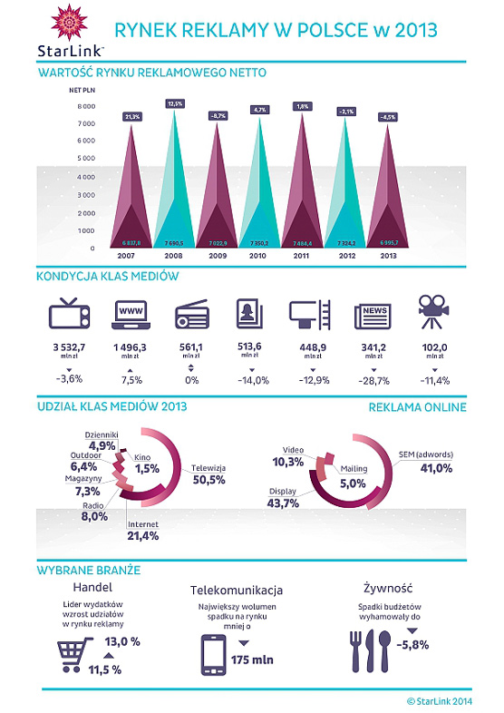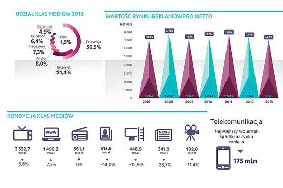 W 2013 jedynym medium, które charakteryzowała wzrostowa dynamika przychodów był Internet (wzrost o 7,5 proc.). W 2013 roku podobny poziom przychodów reklamowych co w 2012 roku osiągnęło radio. Czwarty kwartał 2013 roku to pierwszy od dziesięciu kwartał, w którym zanotowano wzrost w reklamie telewizyjnej (wzrost o 0,3 proc.). W całym 2013 roku wydatki na reklamę telewizyjną skurczyły się o 3,6 proc.