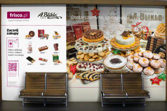Frisco.pl na stacji Centrum warszawskiego metra prowadzi wirtualne supermarkety. Zakupy zamawia się poprzez aplikację w smartfonie, wybierając je z plakatów.