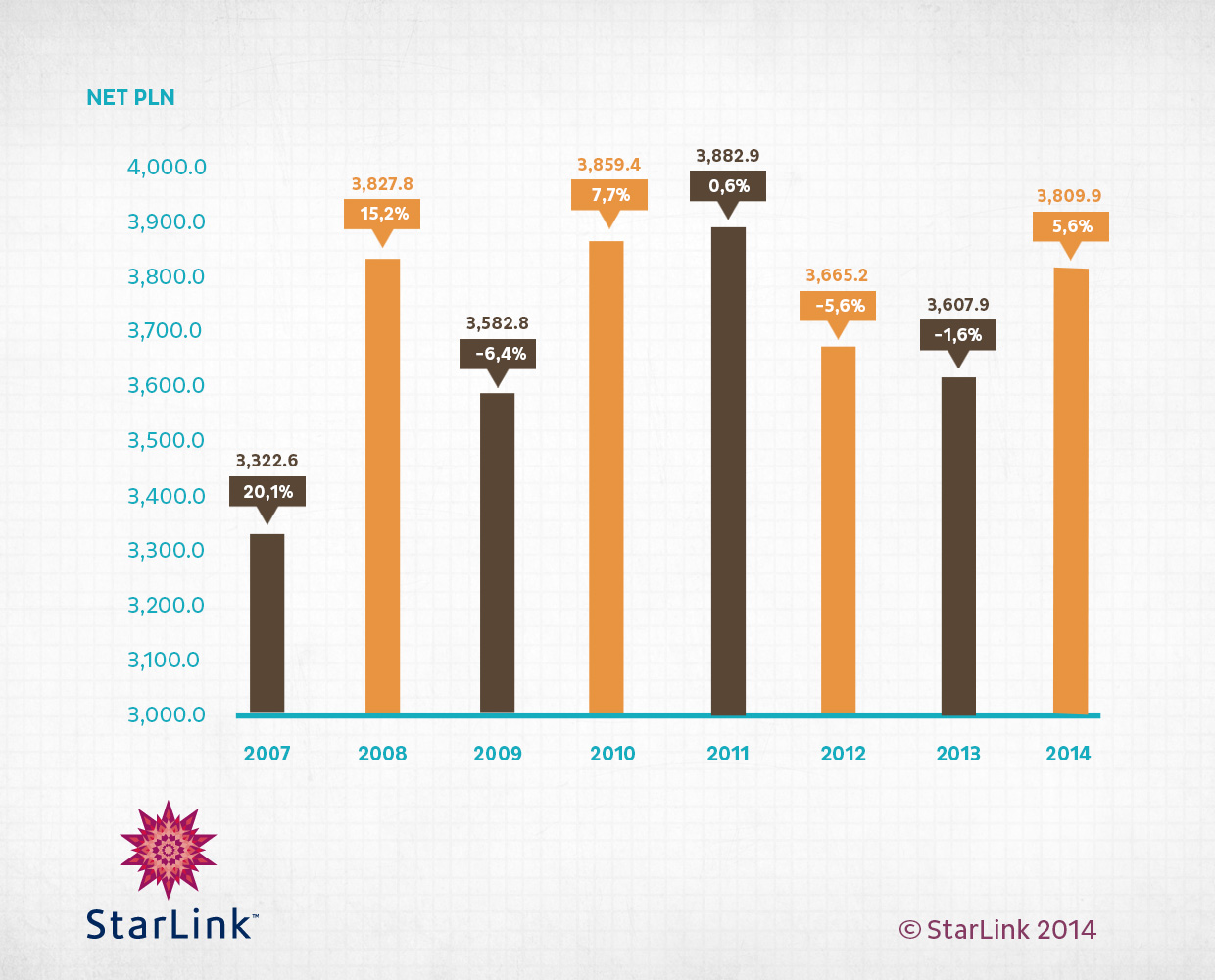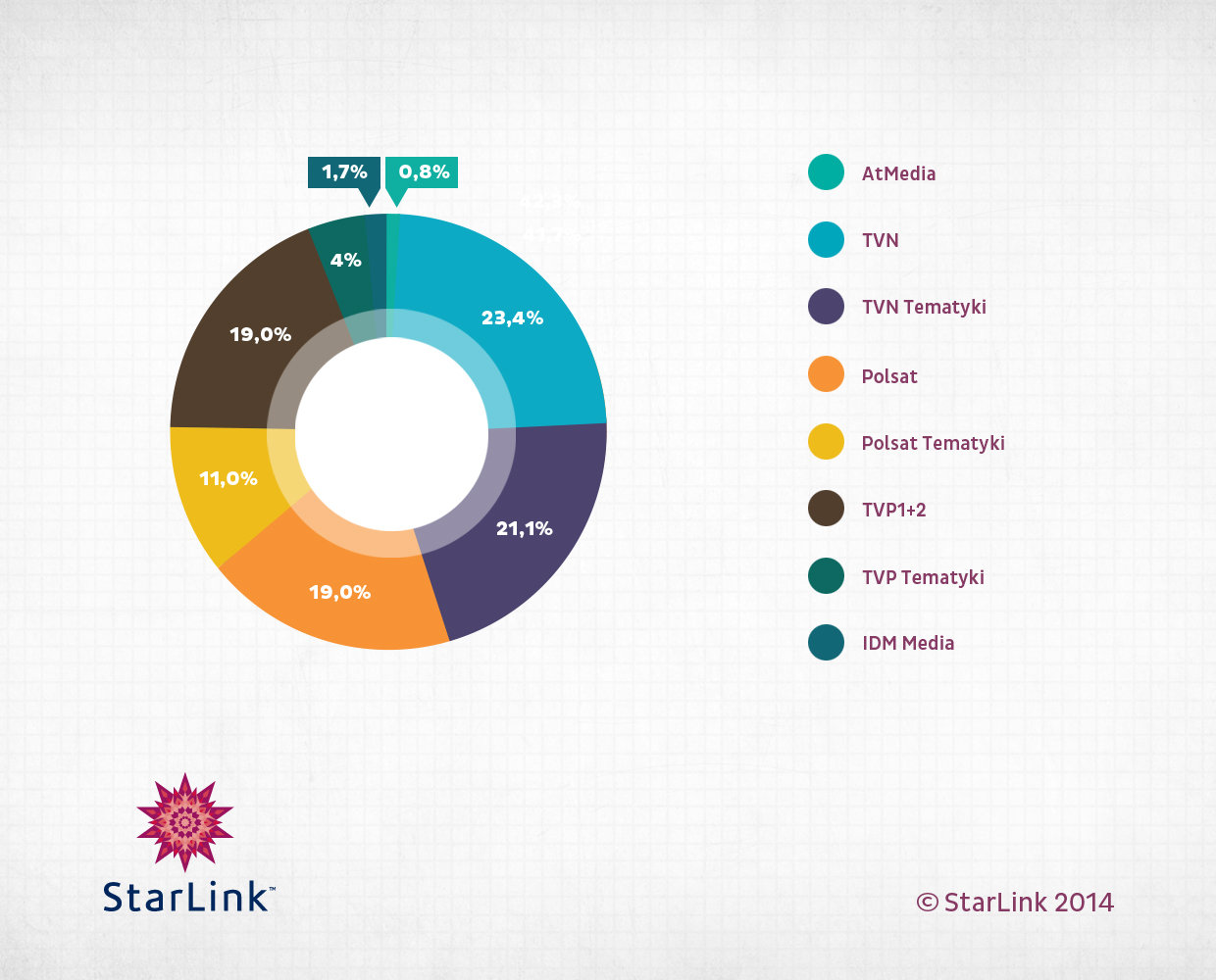 Według domu mediowego Starlink (Grupa Starcom MediaVest) reklamowe wpływy telewizji wzrosły w ub.r. o 5,6 proc. wobec 2013 roku – i wyniosły 3,81 mld zł. Coraz większą porcję tortu reklamowego czterem głównym telewizjom odbierają mniejsze stacje.