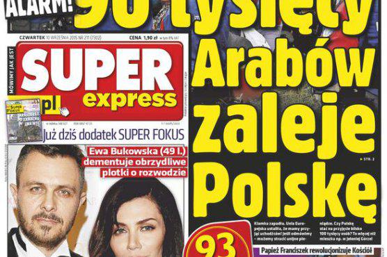 Wczorajszy "Super Express" z pierwszej strony krzyczał: "Alarm! 90 tysięcy Arabów zaleje Polskę". W tle było zdjęcie uchodźców. Tekst podpisany "AN" dotyczył nacisków m.in. na Polskę szefa Komisji Europejskiej Jeana-Claude'a Junckera, aby przyjęły uchodźców z Syrii, Erytrei i Iraku. Na zdjęciach wewnątrz wydania pokazano starcia imigrantów z grecką policją, bezradność węgierskiej policji wobec tłumu uchodźców i "góry śmieci", jakie pozostawiają oni po sobie.