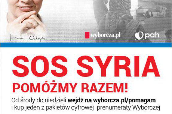 "Gazeta Wyborcza" (Agora SA) cały dochód ze sprzedaży specjalnych pakietów prenumeraty cyfrowej w dniach 16-20 września br. przekaże Polskiej Akcji Humanitarnej. Pieniądze w ramach akcji "SOS Syria. Razem pomagamy lepiej" mają zostać przeznaczone na pomoc uchodźcom wewnętrznym w Syrii.
