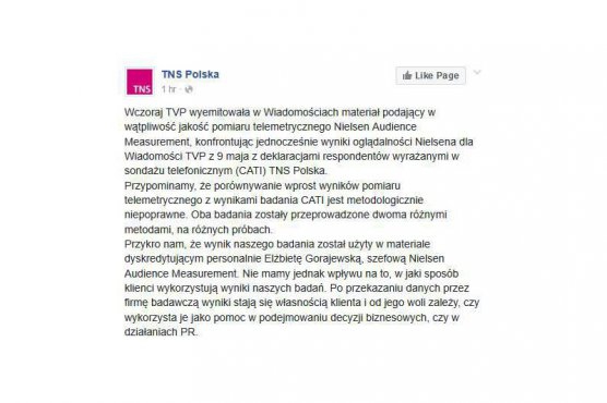 Do sprawy odniosła się za to firma TNS Polska, która wczoraj na swoim profilu na Facebooku napisała, że to, co zrobiły "Wiadomości", czyli „porównywanie wprost wyników pomiaru telemetrycznego z wynikami badania CATI (sondaż telefoniczny – przyp. red.) jest metodologicznie niepoprawne”. TNS odciął się też od drugiej części materiału "Wiadomości", czyli personalnego ataku na szefową Nielsena, Elżbietę Gorajewską. „Przykro nam, że wynik naszego badania został użyty w materiale dyskredytującym personalnie Elżbietę Gorajewską” - napisano na profilu TNS Polska. „Nie mamy jednak wpływu na to, w jaki sposób klienci wykorzystują wyniki naszych badań. Po przekazaniu danych przez firmę badawczą wyniki stają się własnością klienta i od jego woli zależy, czy wykorzysta je jako pomoc w podejmowaniu decyzji biznesowych czy w działaniach PR” - tłumaczy TNS.