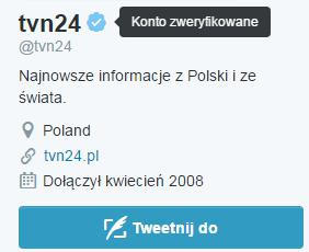 Obecnie zweryfikowane konta ma 187 tys. z 310 mln użytkowników serwisu, większość z nich w USA. W Polsce jest ich niewiele - ma je m.in. TVN 24, Donald Tusk, Paweł Zalewski, "Fakty" TVN i Radosław Sikorski.