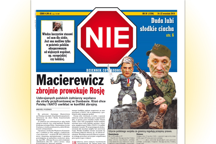Na pierwszą stronę datowanego na 16 września br. numeru "Nie" (Urma) trafił artykuł "Macierewicz zbrojnie prowokuje Rosję" Andrzeja Rozenka. Były poseł (z listy Ruchu Palikota) i były zastępca redaktora naczelnego tygodnika "Nie" donosi, że 18 polskich komandosów i oficera Służby Kontrwywiadu Wojskowego minister Antoni Macierewicz wysłał "do strefy przyfrontowej w Donbasie". Uzbrojeni "po zęby" mają stacjonować "80 km od linii frontu".