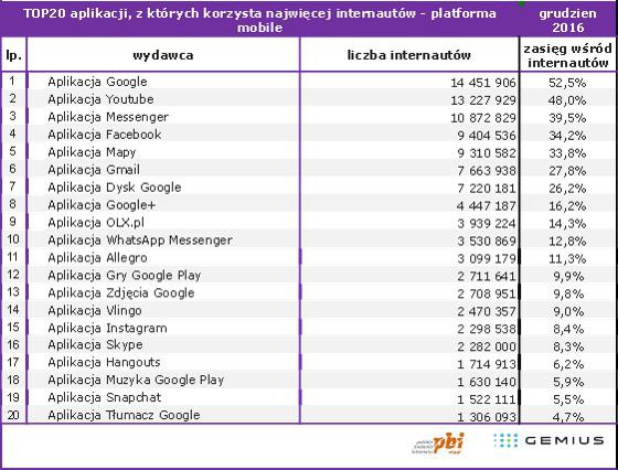 Najpopularniejszą aplikacją według badania jest Google - korzysta z niej 14,452 mln polskich użytkowników. Na kolejnych miejscach znalazły się: YouTube (13,228 mln) i Messenger (10,873 mln). Najpopularniejszą polską aplikacją jest Olx.pl, która uplasowała się na 9. miejscu z 3,939 mln użytkowników. W pierwszej dwudziestce spośród polskich aplikacji jest jeszcze tylko Allegro na 11. miejscu z 3,099 mln użytkowników. 15 z 20 najpopularniejszych aplikacji należy do Google`a i Facebooka.