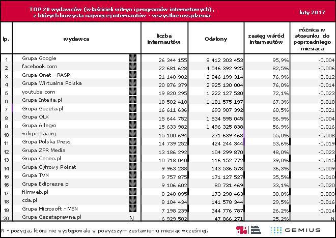 Liderem polskiego internetu w lutym br. była Grupa Google, którą odwiedziło 26,344 mln internautów – o 0,09 proc. więcej w porównaniu do stycznia br. Drugi był Facebook z 22,682 mln użytkowników (spadek o 0,25 proc.), trzecia Grupa Onet-RASP - 21,141 mln (spadek o 1,11 proc.), a czwarta Grupa Wirtualna Polska - 20,876 mln (spadek o 1,3 proc.). Przewaga Grupy Onet-RASP nad Grupą WP zwiększyła się do 264,5 tys. użytkowników (miesiąc wcześniej różnica wynosiła 229 tys. użytkowników).
