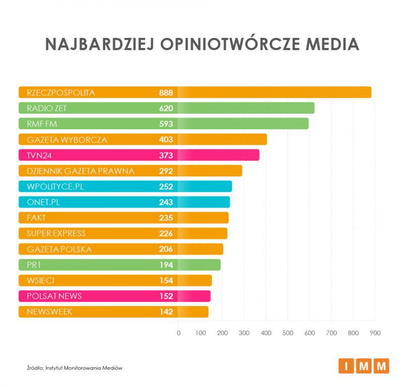 Wśród stacji telewizyjnych najczęściej wspominany był kanał TVN 24 (373), głównie w związku z wyborem Donalda Tuska na przewodniczącego Rady Europejskiej. Spośród stron internetowych zakwalifikowanych przez IMM jako portale opiniotwórcze najczęściej cytowano Wpolityce.pl (252), w związku z wypowiedzią ambasadora w Niemczech Andrzeja Przyłębskiego w sprawie informacji o jego współpracy z komunistycznymi służbami.