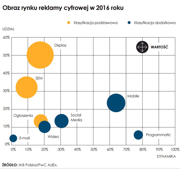 Autorzy raportu zauważają, że polski rynek reklamy online jest dojrzały i nie pojawiają się na nim większe zmiany, np. nowi gracze. Wzrost rok do roku jest niższy niż w 2015 roku (wtedy wyniósł 20 proc.). Dominująca jest nadal reklama display, która stanowi ponad połowę rynku (1,82 mld zł w ub.r.). Najsilniej reklama display rozwija się w segmentach: wideo, media społecznościowe i mobile. Wzrost jest jednak znacząco słabszy niż w 2015 roku, gdy rynek display mobile wzrósł rok do roku o 256 proc., a w 2016 o 64 proc.