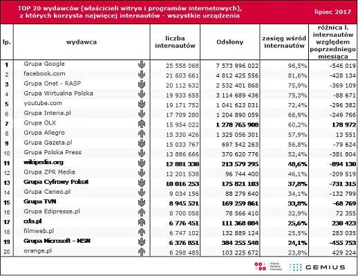 Liderem polskiego internetu w lipcu 2017 roku była Grupa Google, którą odwiedziło 25,558 mln internautów – o 546 tys. mniej niż w czerwcu br. Drugi był Facebook z 21,604 mln użytkowników (spadek o 428 tys.), trzecia Grupa Onet-RASP - 20,113 mln (spadek o 369 tys.), a czwarta Grupa Wirtualna Polska - 19,934 mln (spadek o 87 tys.). Przewaga Grupy Onet-RASP nad Grupą WP zmniejszyła się do 179 tys. użytkowników.
