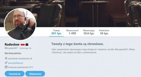 W środę wpisy Radosława Poszwińskiego przestały być widoczne dla wszystkich użytkowników Twittera. ”Tweety z tego konta są chronione. Tylko zatwierdzeni obserwujący mają dostęp do Tweetów i profilu @bogdan607. Kliknij «Obserwuj», aby wysłać prośbę o zatwierdzenie” – taka znalazła się adnotacja na jego koncie.