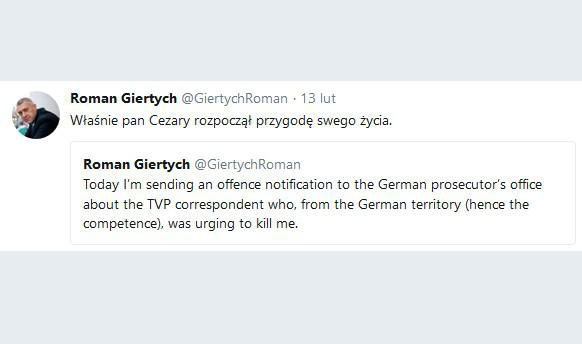 "Dziś do niemieckiej prokuratury wysyłam zawiadomienie o popełnieniu przestępstwa. Chodzi o korespondenta TVP, który z terytorium Niemiec (stąd kompetencje) nawoływał do zabicia mnie" - napisał 13 lutego br. na Twitterze Giertych.