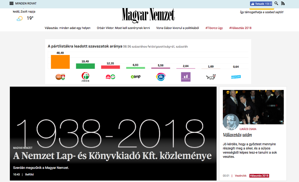 „Z powodu problemów finansowych dziennika <<Magyar Nemzet>>, na podstawie decyzji właścicieli, od 11 kwietnia 2018 roku wydawca kończy dostarczanie treści medialnych, wobec czego przestaje się ukazywać <<Magyar Nemzet>> i jego wersja internetowa. Ostatni drukowany numer powstałego 80 lat temu dziennika <<Magyar Nemzet>> ukaże się jutro, 11 kwietnia” – napisał wydawca.