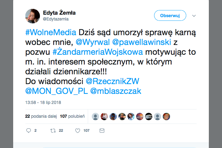 Sąd Rejonowy w Krakowie umorzył postępowanie karne wobec dziennikarzy portalu Onet.pl – Marcina Wyrwała, Edyty Żemły i Pawła Ławińskiego z prywatnego aktu oskarżenia Żandarmerii Wojskowej. Chodzi o serię tekstów opublikowanych w Onecie, m.in. o molestowaniu i mobbingu w ŻW.
